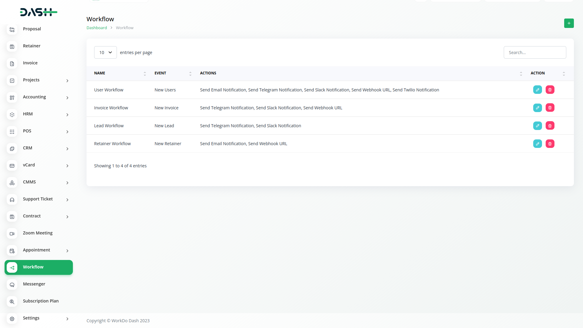 Workflow automation triggers notifications (email, Slack, Telegram, Twitter) for new invoices, user leads, projects. It monitors status and sends personalized alerts. Streamlines communication and updates for efficient processes.