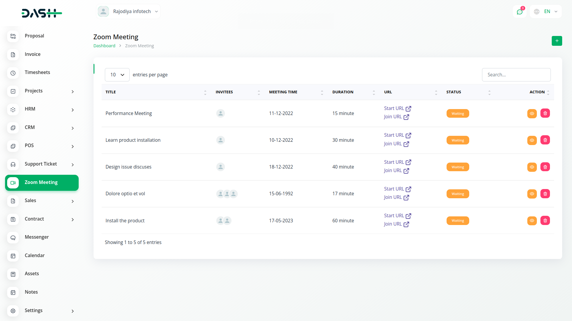 Virtual meetings are no new to us. The Zoom Integration provides a platform where you can create a zoom meeting after giving inputs of asked details like; Client, User(s), Meeting Time, and Duration, and it generates a link through which people can join the meeting. You can create, View, Start, and Delete meetings with ease.